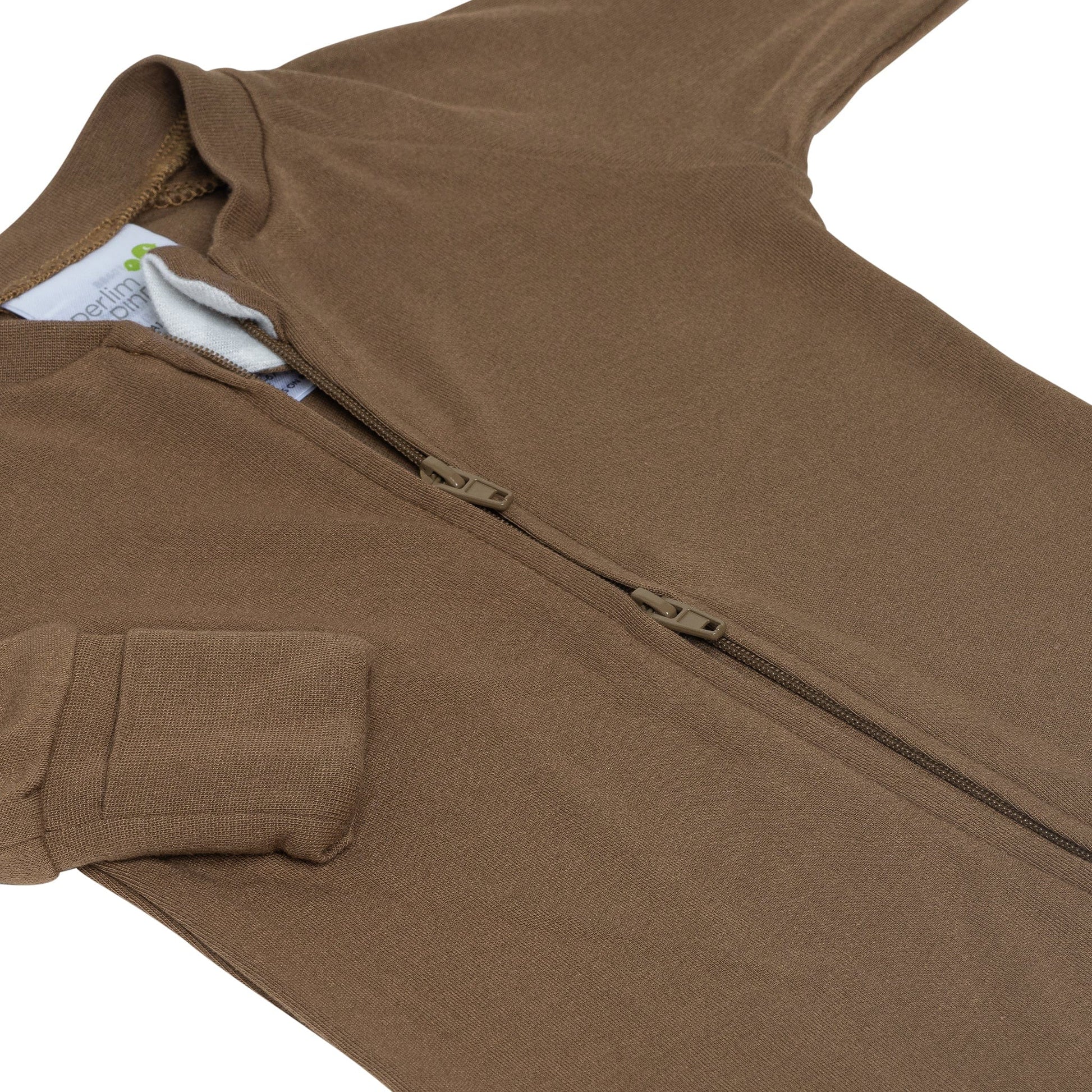 Wrap your little one in comfort with our bamboo baby sleeper in a warm, earthy tone. Crafted from a blend of bamboo viscose and cotton, this sleeper is perfect for sensitive skin, offering a soft and breathable feel. Designed in Canada with a convenient zipper for easy changes and fold-over mitts for added safety, this sleeper is a staple for any nursery. The natural antibacterial properties of bamboo provide peace of mind, making it ideal for all seasons. An essential piece for layering or wearing alone, thoughtfully created by parents, for parents.