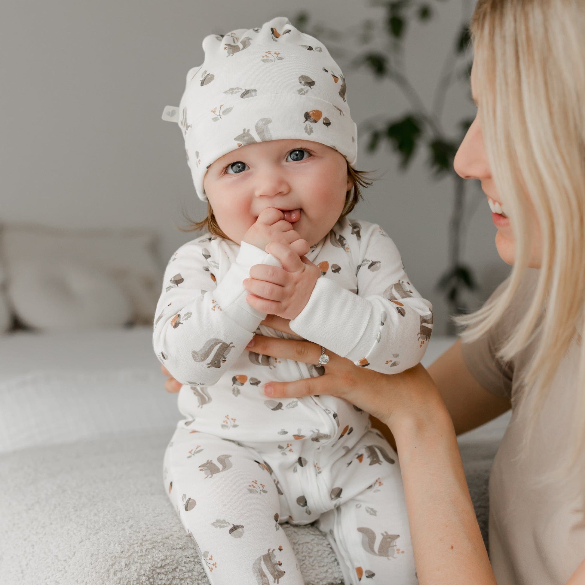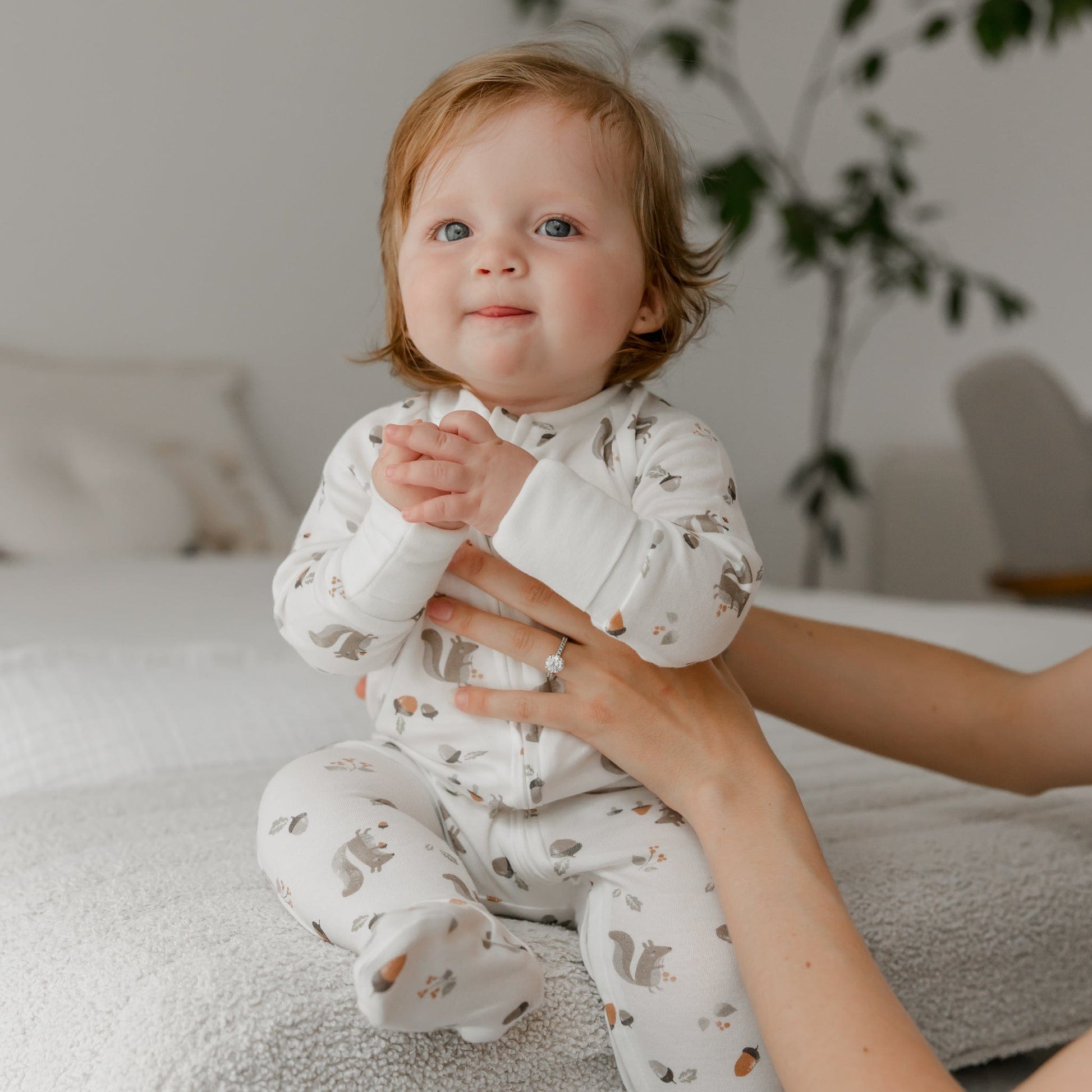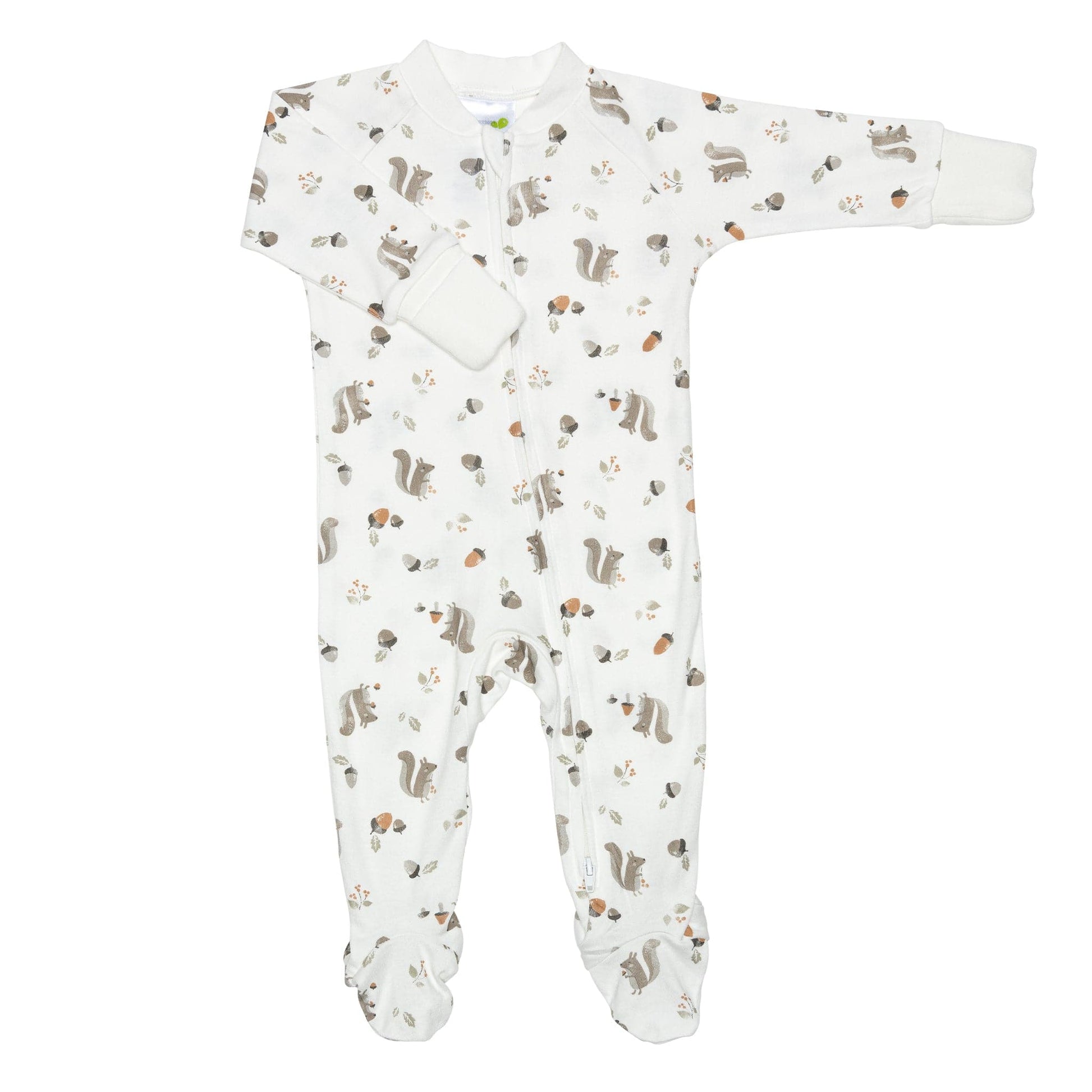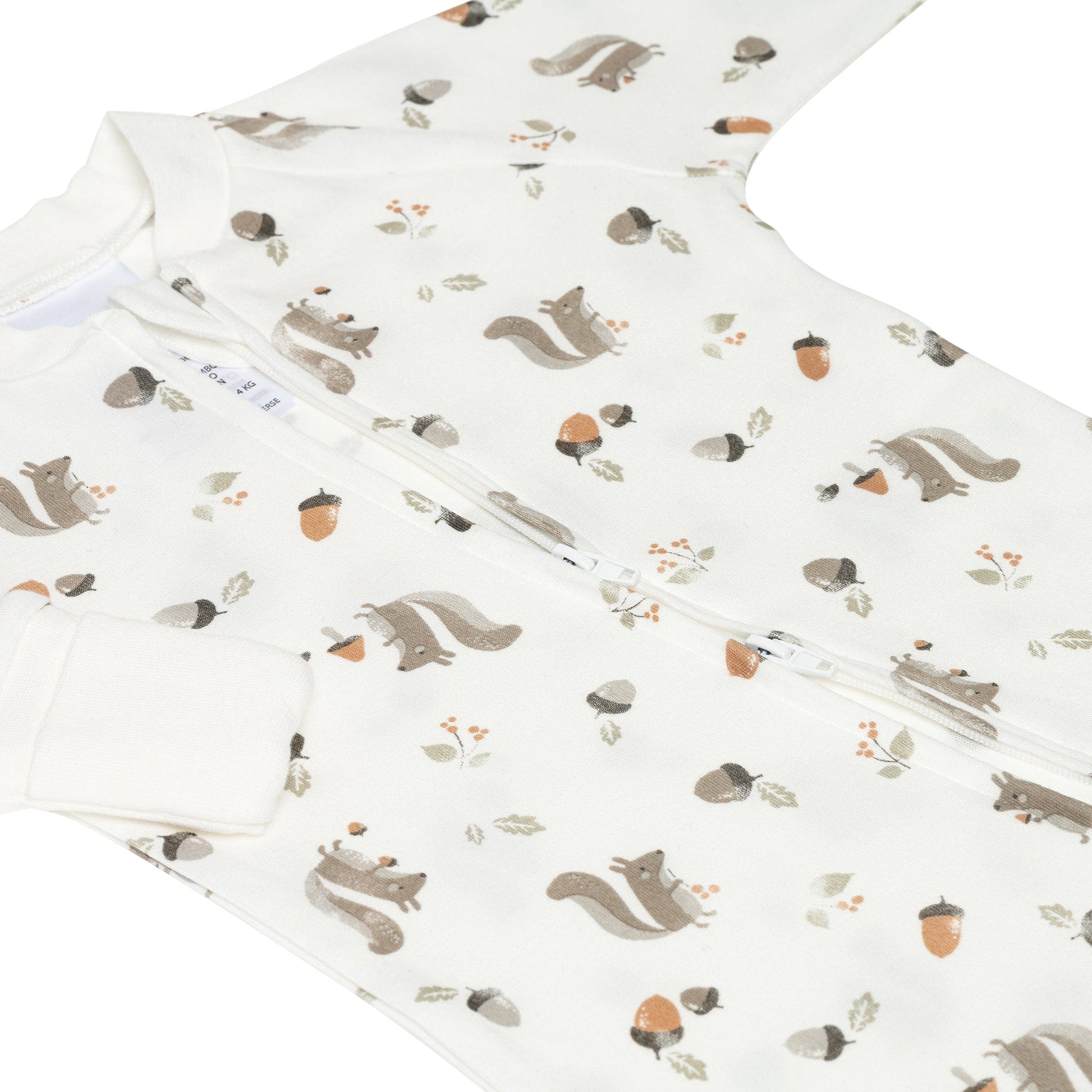 Wrap your baby in the comfort of our bamboo baby sleeper, featuring an adorable squirrel print. The soft bamboo-cotton blend offers a gentle touch on sensitive skin, making it perfect for little ones with allergies or eczema. Designed in Canada, this sleeper includes a convenient zipper for easy diaper changes and fold-over mitts to keep tiny hands cozy and scratch-free. The natural antibacterial properties of bamboo provide added peace of mind, ensuring your baby is protected through every nap and nighttime slumber. Let this charming piece become a staple in your baby's wardrobe, perfect for layering or wearing alone.