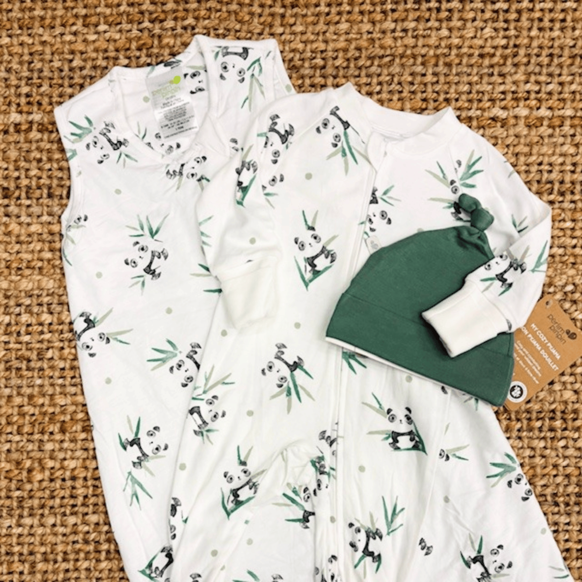 The Panda bamboo Bundle includes a 1.0 TOG 6‑18 month sleep sack with a panda design, a 6 months panda sleeper, and a hunter green knotted hat in size 6-9 months.