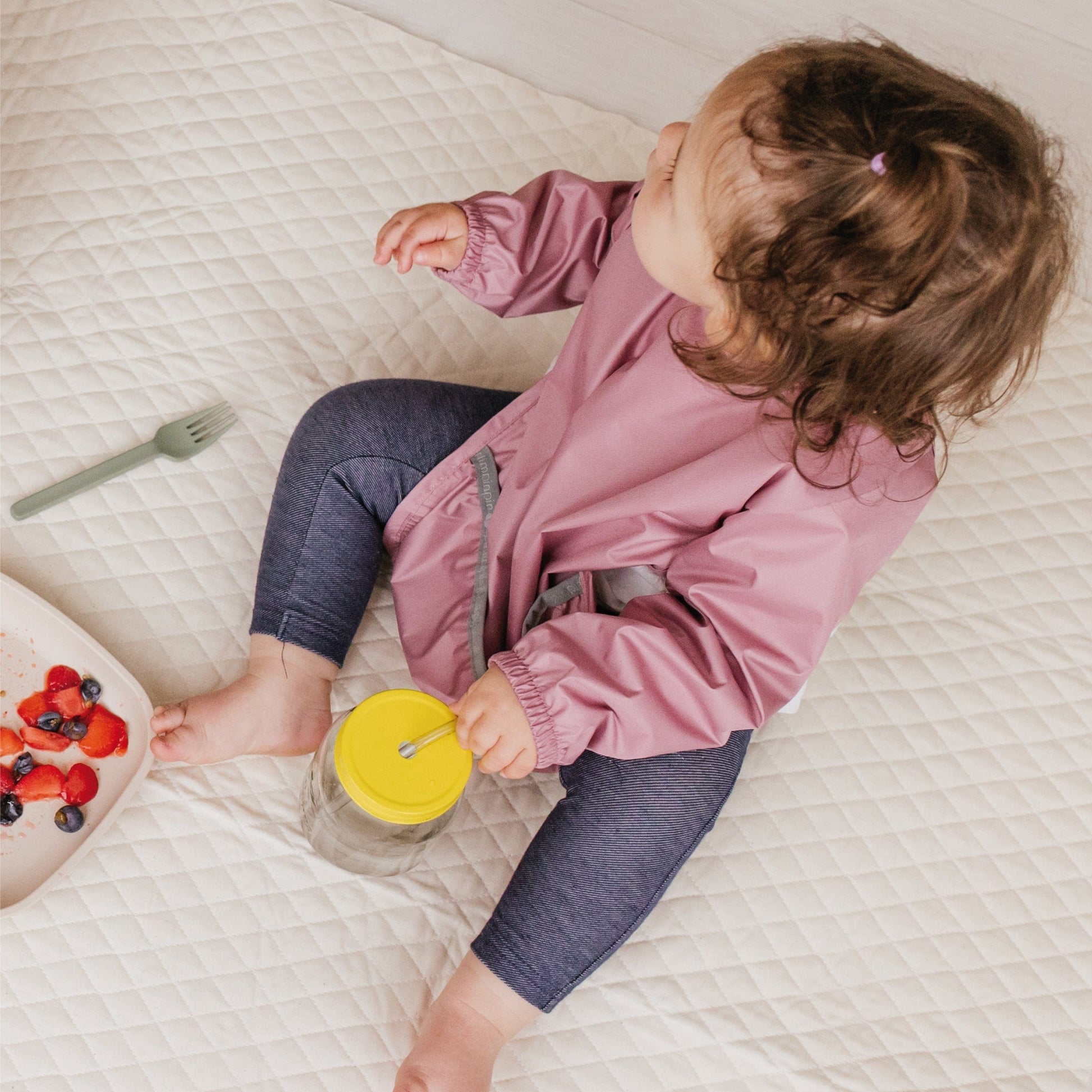Step 2 : Bib with sleeves ! Made from recycled fabric, this bib for toddlers with protective sleeves will be your best ally in preparing baby for independent feeding (DME).
