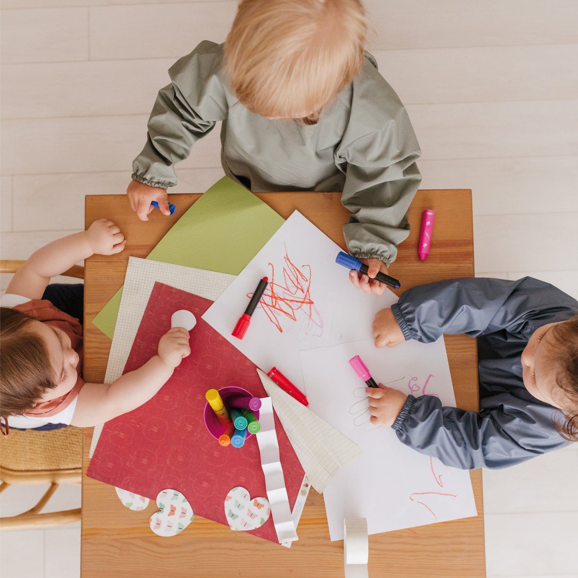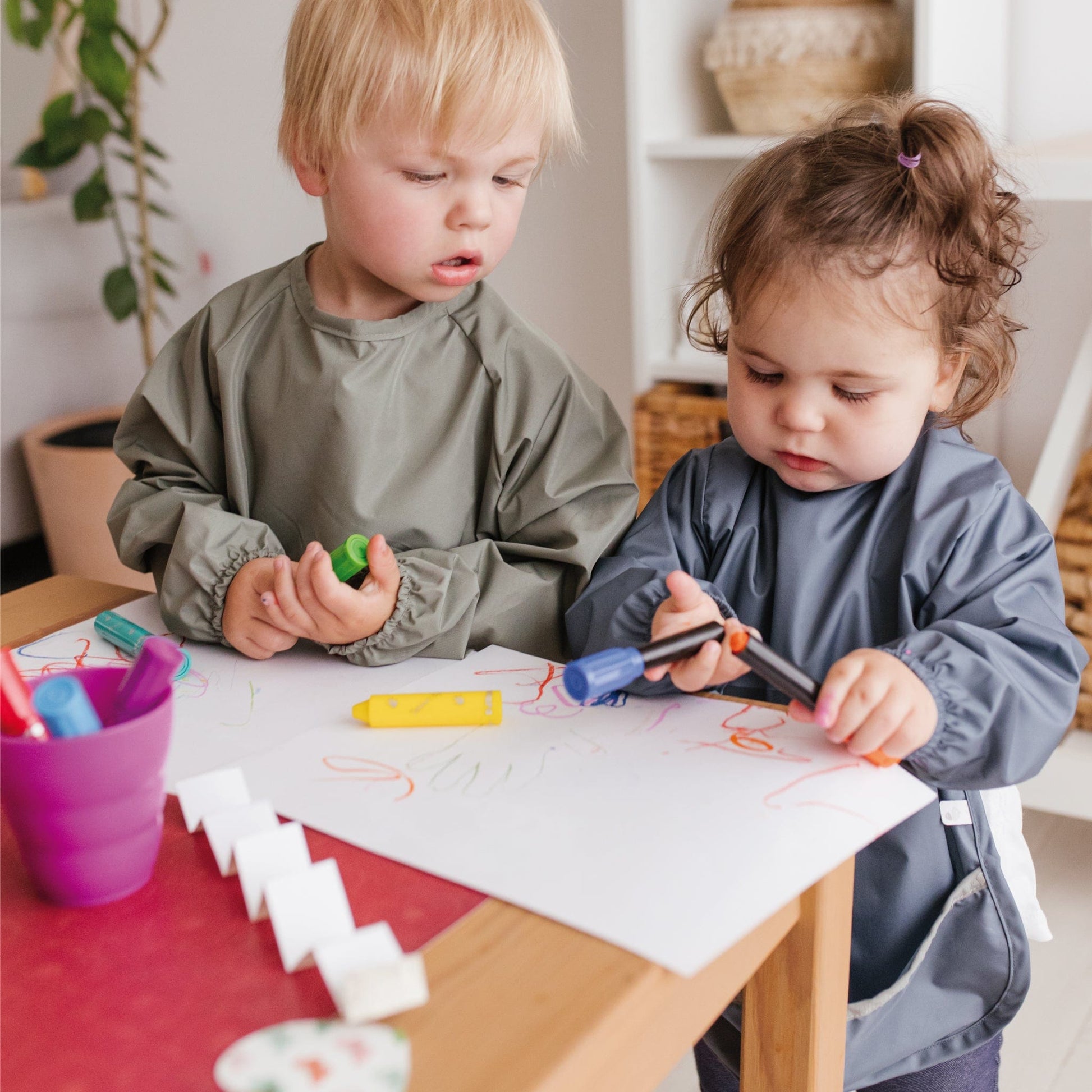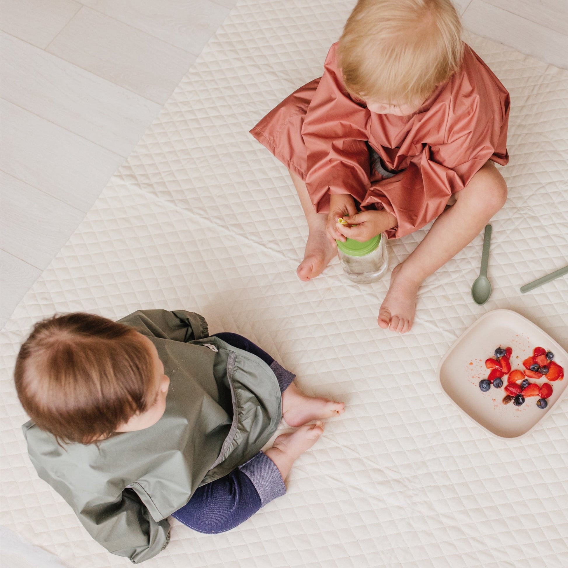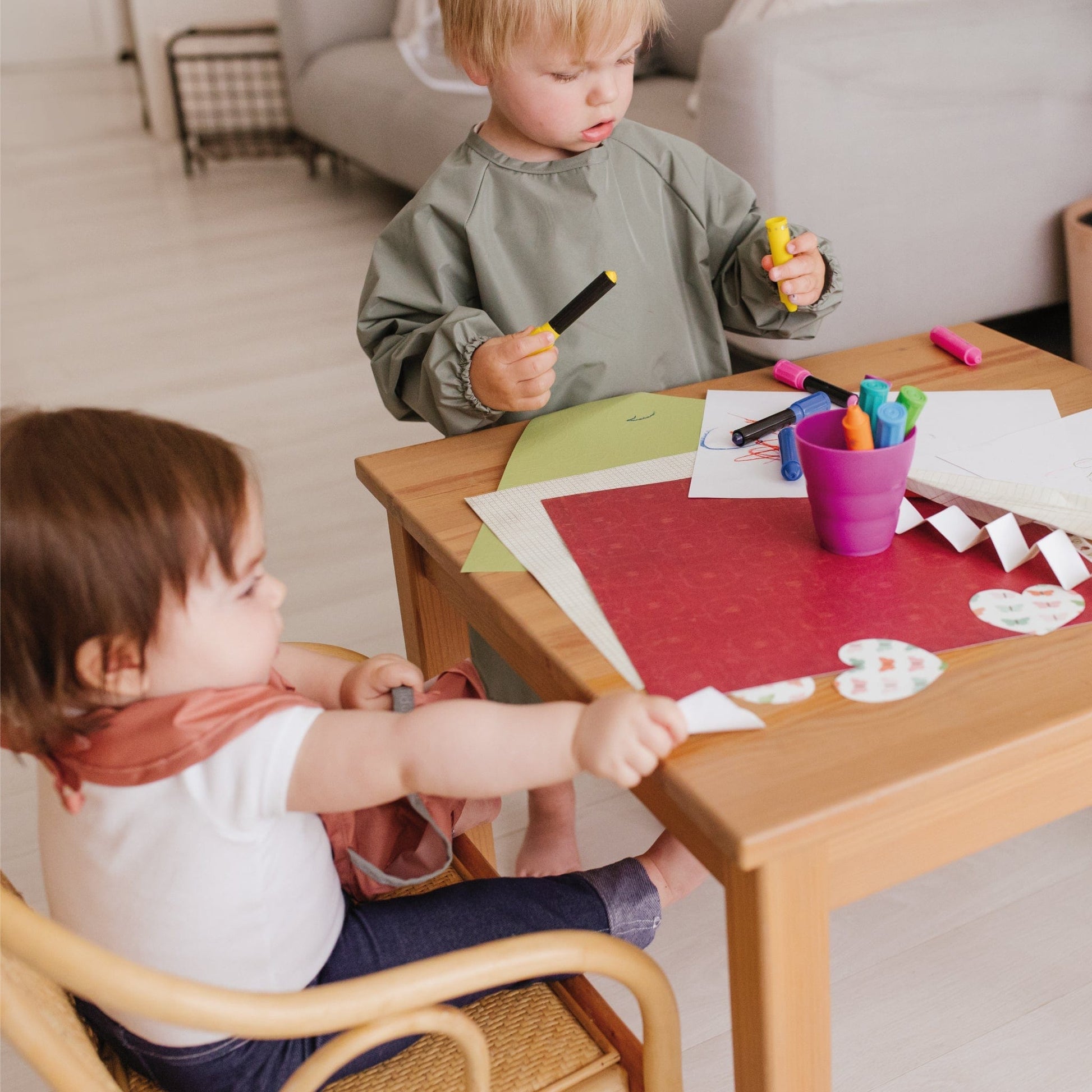Step 2 : Bib with sleeves ! Made from recycled fabric, this bib for toddlers with protective sleeves will be your best ally in preparing baby for independent feeding (DME).