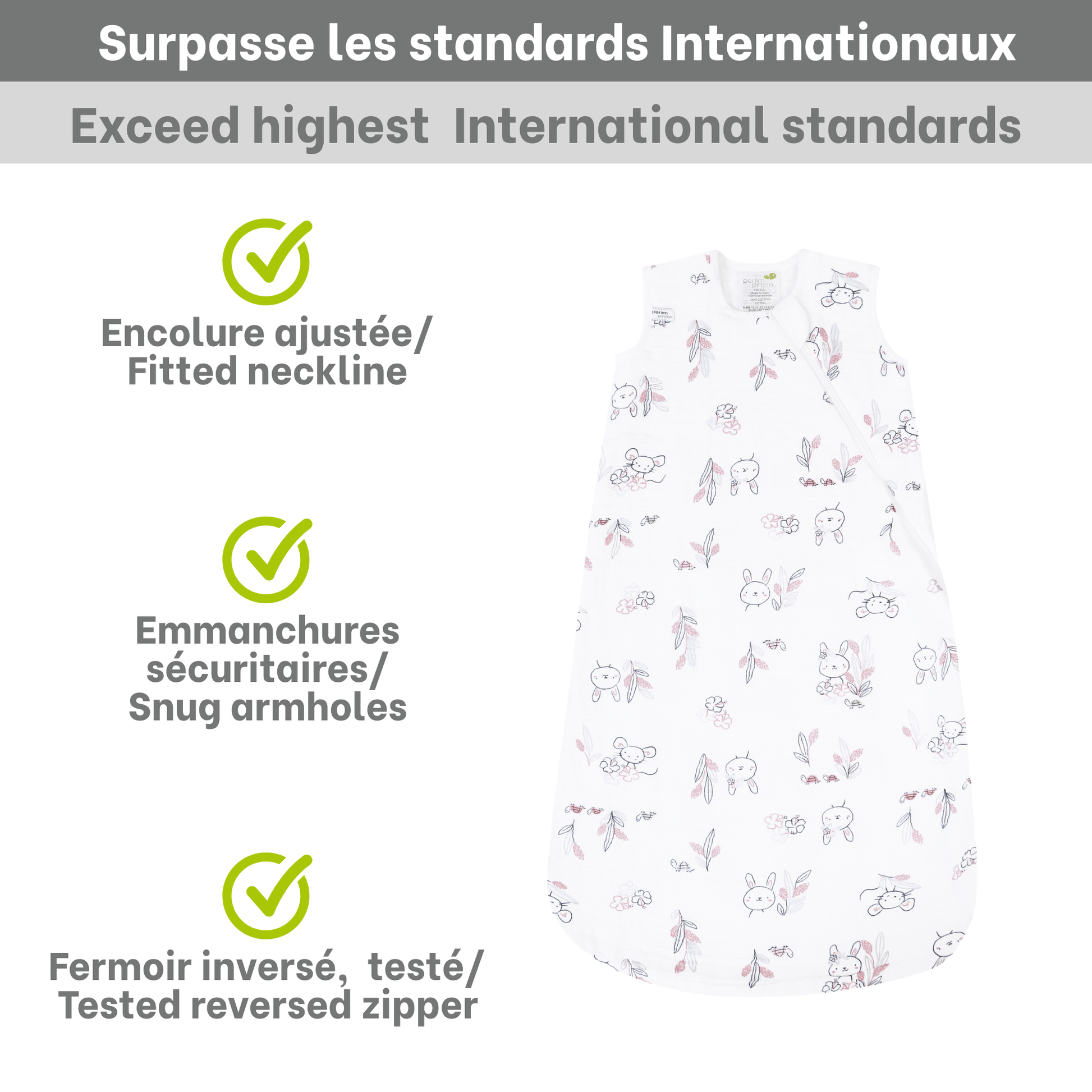 This cotton muslin sleep sack 0.7 TOG wraps your baby in airy comfort while supporting safe, worry-free nights. As a lightweight muslin sleep sack for summer baby naps and warmer rooms, it offers the perfect balance of softness and breathability. The gentle allover print features hand-drawn little bunnies, tiny flowers, and feathery leaves in calm pastel tones, bringing a sweet, storybook feel to the crib. Thoughtfully designed in Canada by parents, this Perlimpinpin muslin wearable blanket replaces loose blankets and helps your baby maintain a comfortable temperature. The secure neckline, sleeveless cut, and roomy bottom allow natural movement while keeping your little one snug. Rigorously tested by third-party labs, this breathable cotton muslin sleep bag 0.7 tog meets international safety standards, so you can focus on bedtime cuddles and trust that your baby is resting peacefully.
