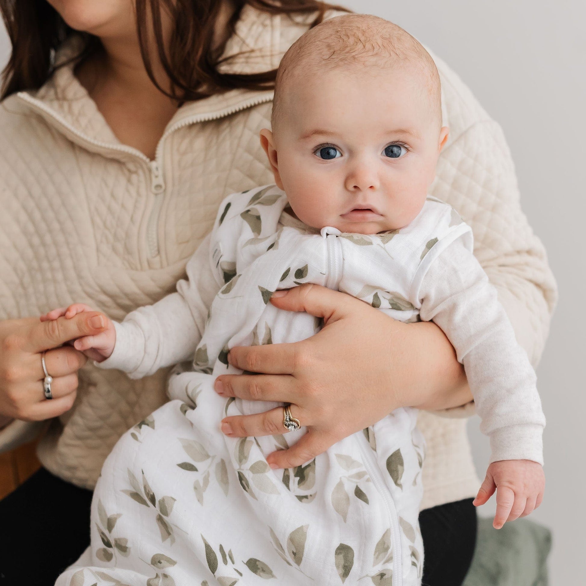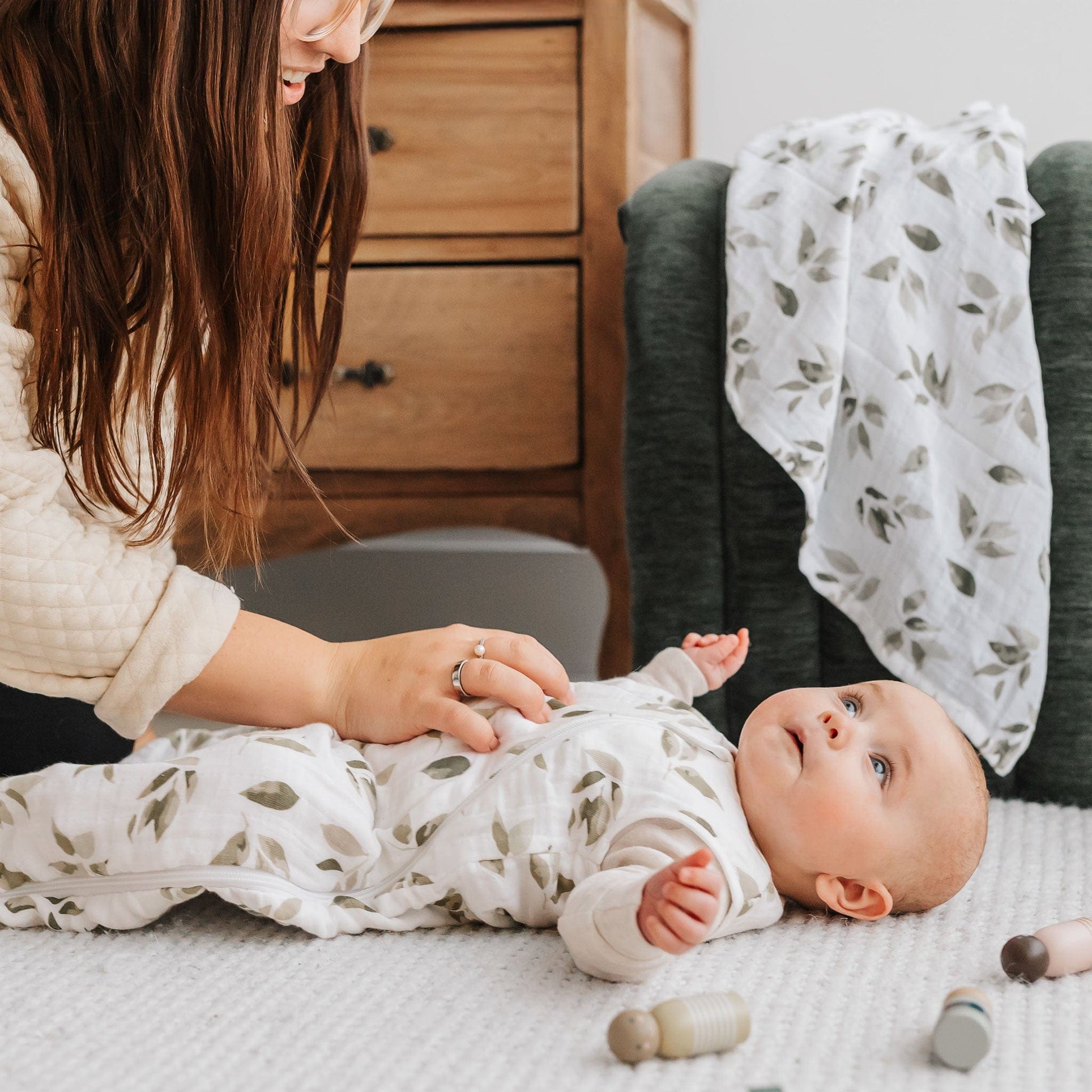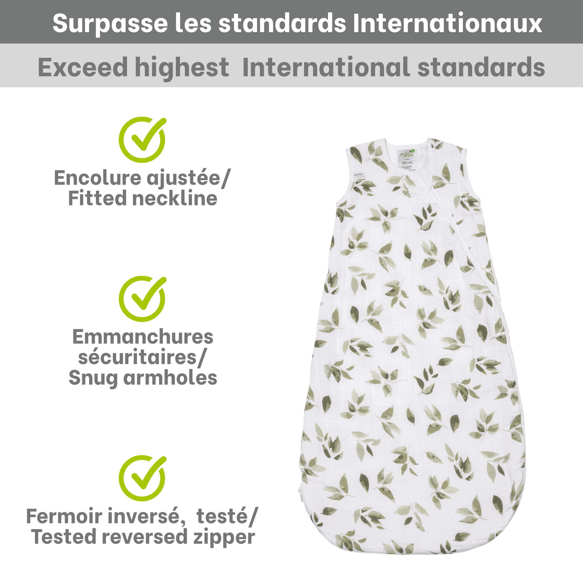 Wrap your baby in the comfort of nature with our 0.7 TOG cotton muslin sleep sack. Adorned with a gentle leaf pattern, it offers a serene backdrop for restful nights. Perfect for warmer temperatures, this breathable and soft sleep sack ensures your baby stays cozy without overheating. Designed in Canada, it features a secure neckline and an inverted zipper for easy, quiet diaper changes. Rigorously tested to meet international safety standards, it provides peace of mind while complementing your baby's sleep routine with a touch of the outdoors.
