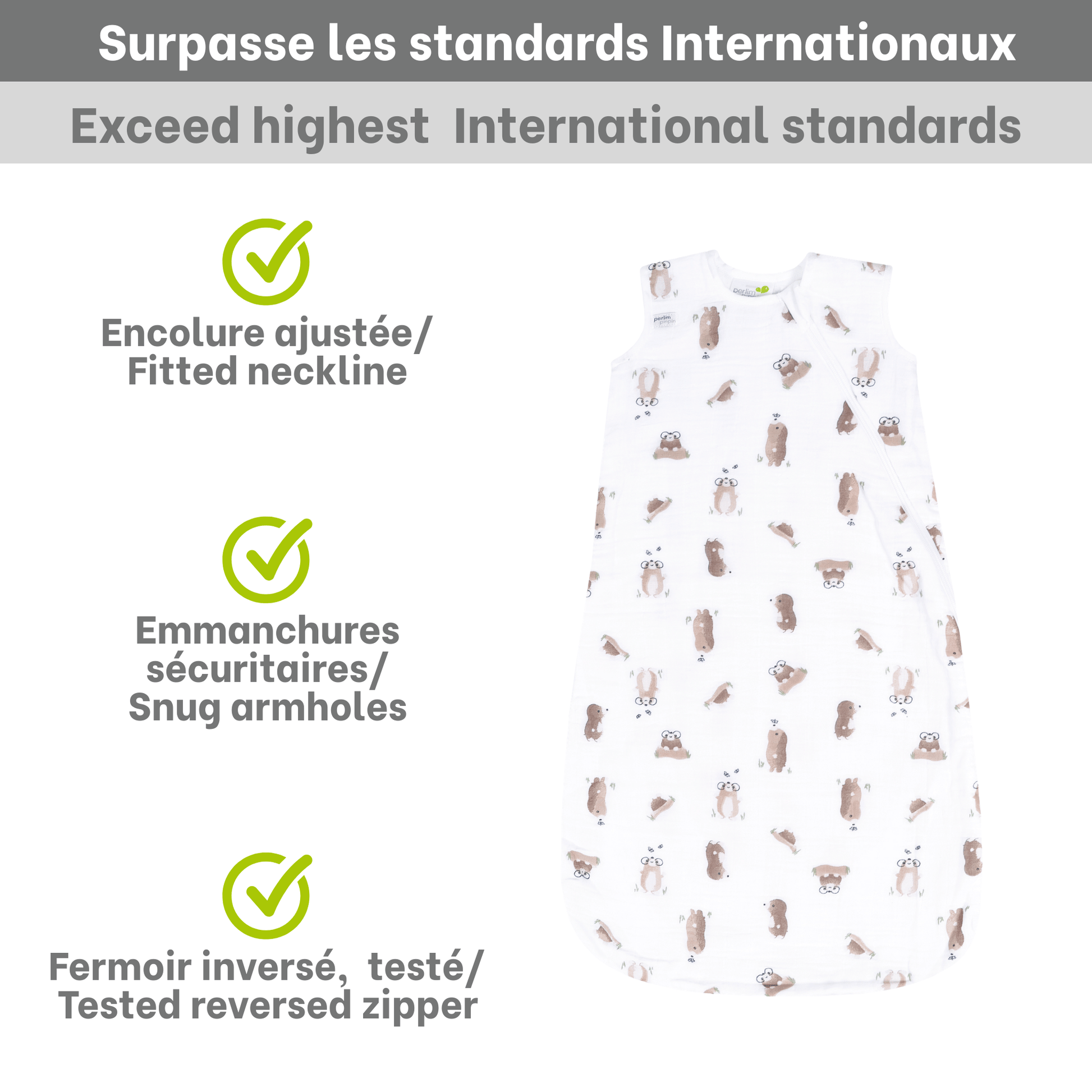 This cotton muslin sleep sack 0.7 TOG wraps your baby in breathable comfort while keeping bedtime simple and safe. As a lightweight muslin sleep sack for summer baby naps and nights, it helps maintain a cozy, consistent temperature so you can relax. The soft cotton muslin features a playful pattern of friendly little moles scattered across a calm, airy background, adding a touch of whimsy to the crib. Designed in Canada by parents, for parents, this Perlimpinpin muslin wearable blanket includes a reverse zipper for easy changes, a secure neckline, and a roomy shape that supports healthy hip movement. Rigorously tested by third-party labs, it meets international safety standards, giving you confidence in your baby’s sleep environment. Ideal as a baby sleep sack spring summer 0.7 tog, it’s a trusted part of your nighttime routine.
