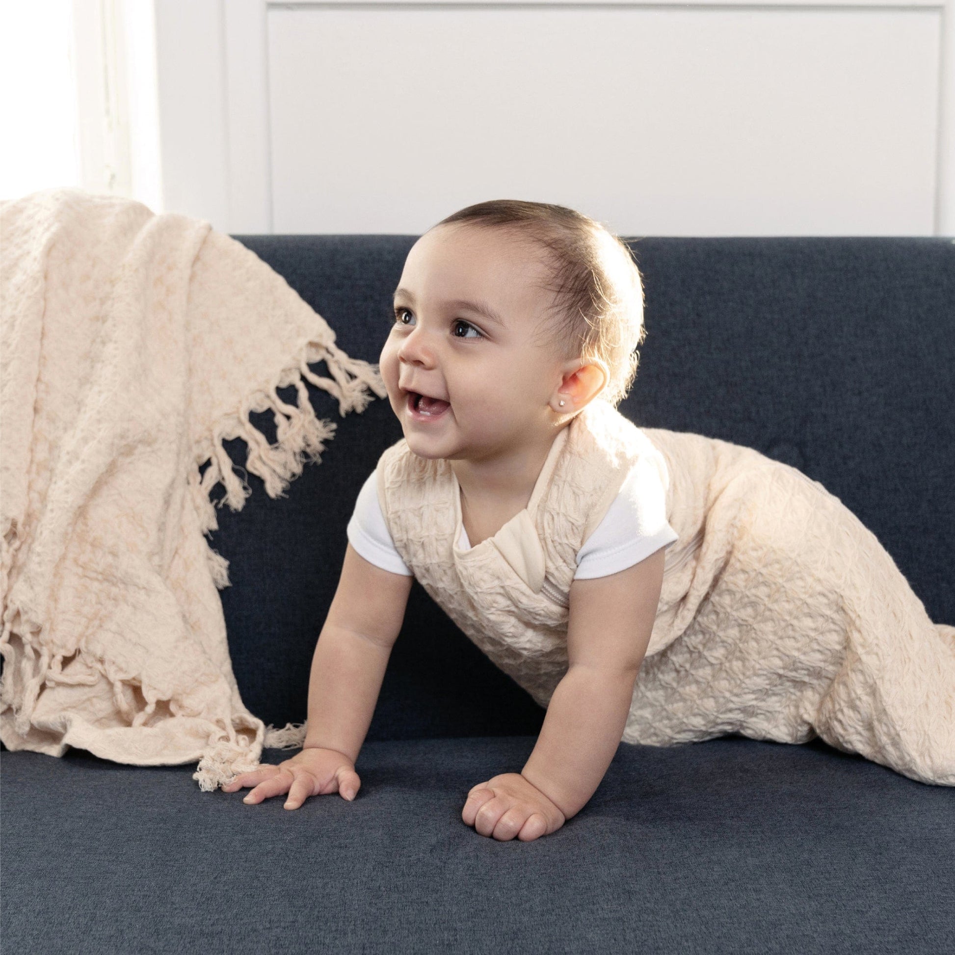 Our new waffle muslin made of 100% organic cotton is the absolute perfection for all year round. Light and breathable, this fabric allows airflow, helping reduce the risk of overheating. This beautiful texture is also available as a sleepsack.