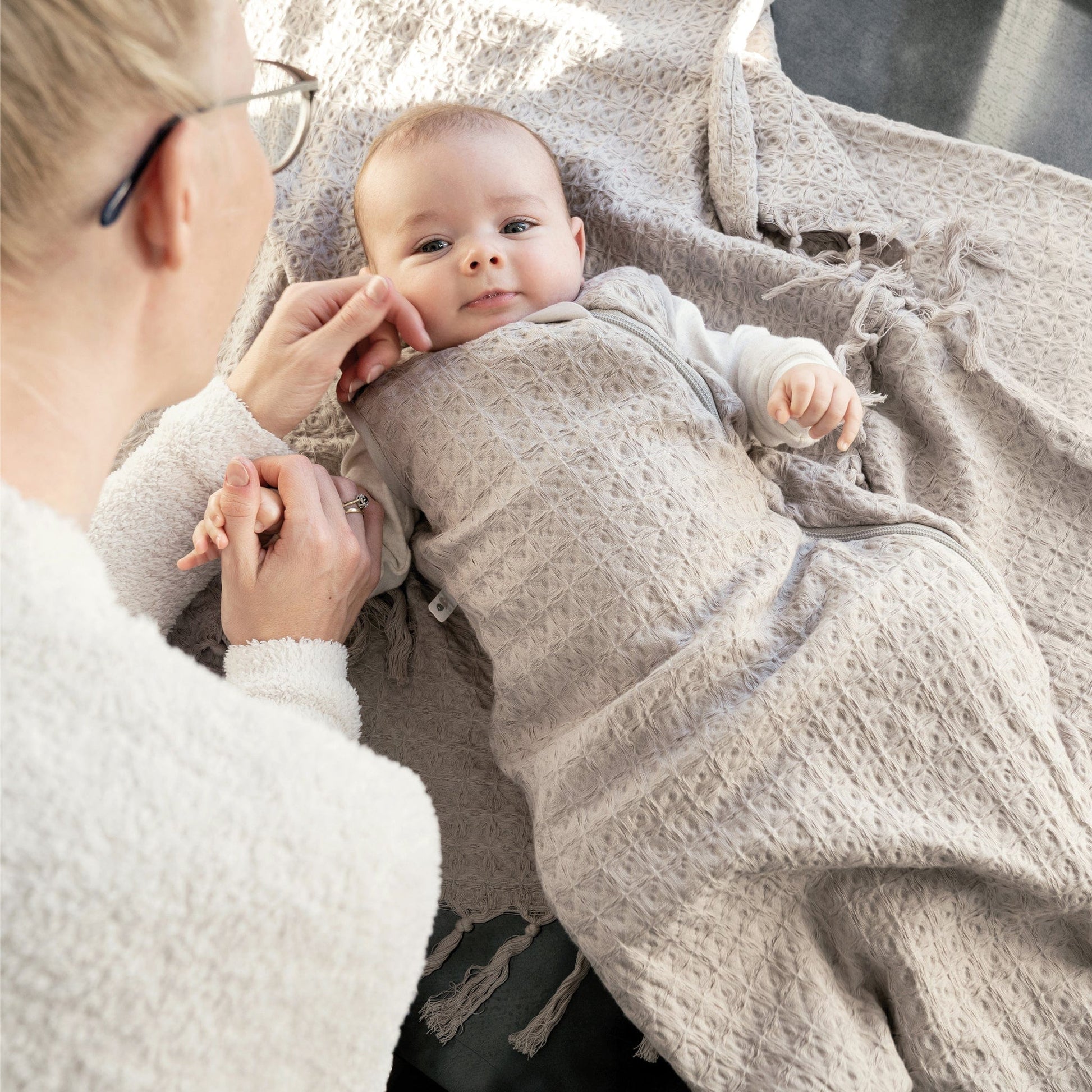 Our new waffle muslin made of 100% organic cotton is the absolute perfection for all year round. Light and breathable, this fabric allows airflow, helping reduce the risk of overheating. This beautiful texture is also available as a sleepsack.