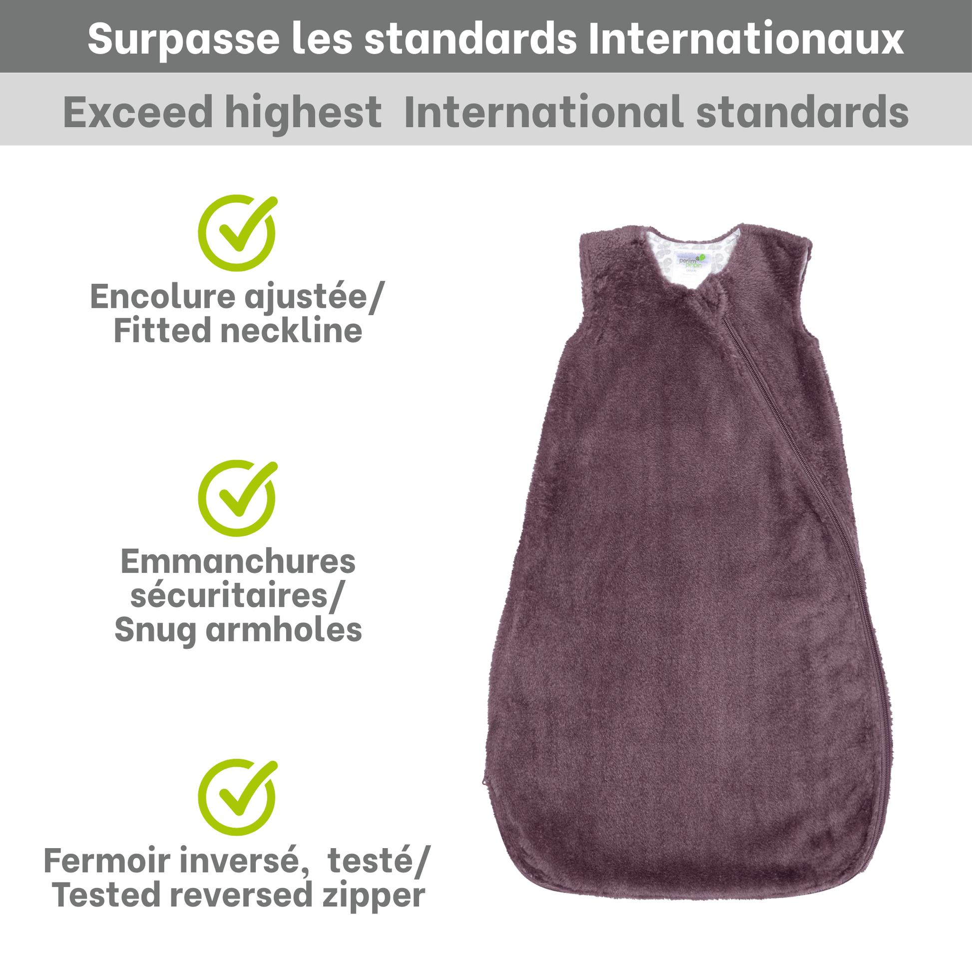 Wrap your baby in warmth and comfort with our plush baby sleep sack, designed to provide peace of mind every night. This sleep sack, with its gentle grape hue, is crafted from recycled polyester, reflecting Perlimpinpin's commitment to sustainability. Perfect for the chilly Canadian winter, its plush texture offers a snug fit while allowing freedom of movement. The reverse zipper design ensures easy diaper changes without disturbing your baby’s slumber. Designed in Canada, it meets rigorous international safety standards, making it a trusted choice for your little one’s bedtime routine.