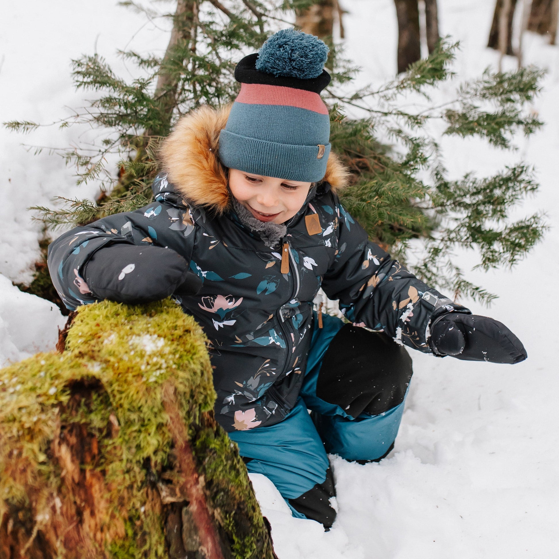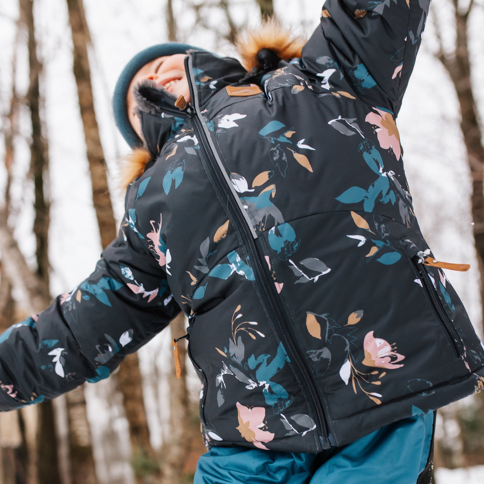 Embrace winter with confidence in our kids snowsuit, thoughtfully designed for comfort and warmth. The enchanting floral pattern dances across a rich dark background, creating a beautiful contrast that captures the magic of winter. This snowsuit includes recycled materials, selected with care to support thoughtful design. The breathable, weather-resistant fabric ensures your child stays cozy during outdoor adventures, while the removable faux-fur hood adds a touch of elegance. Designed in Canada, this versatile two-piece snowsuit is perfect for winter play and family outings, offering peace of mind with its durable construction.