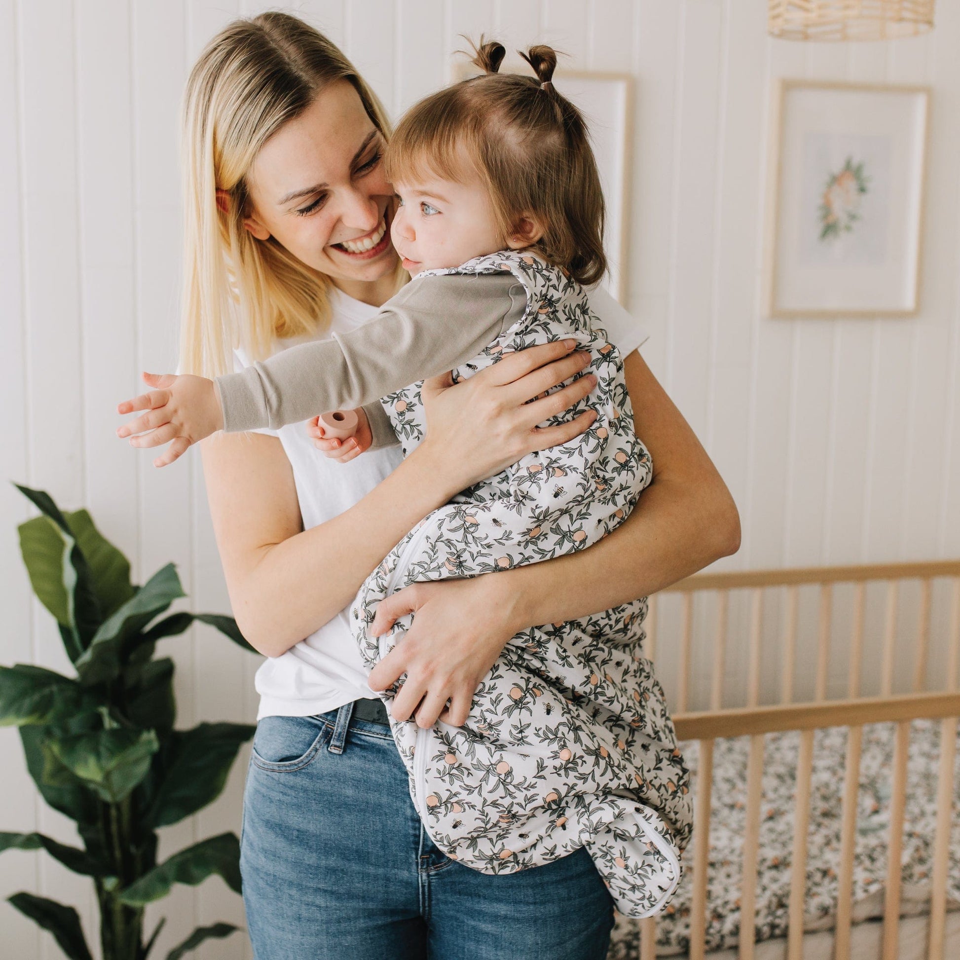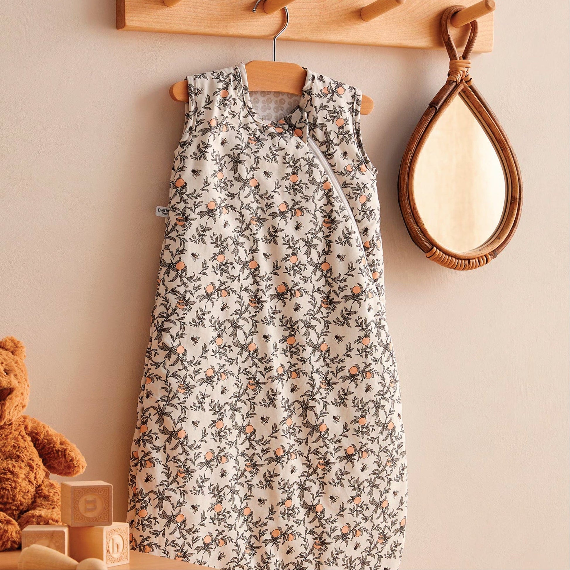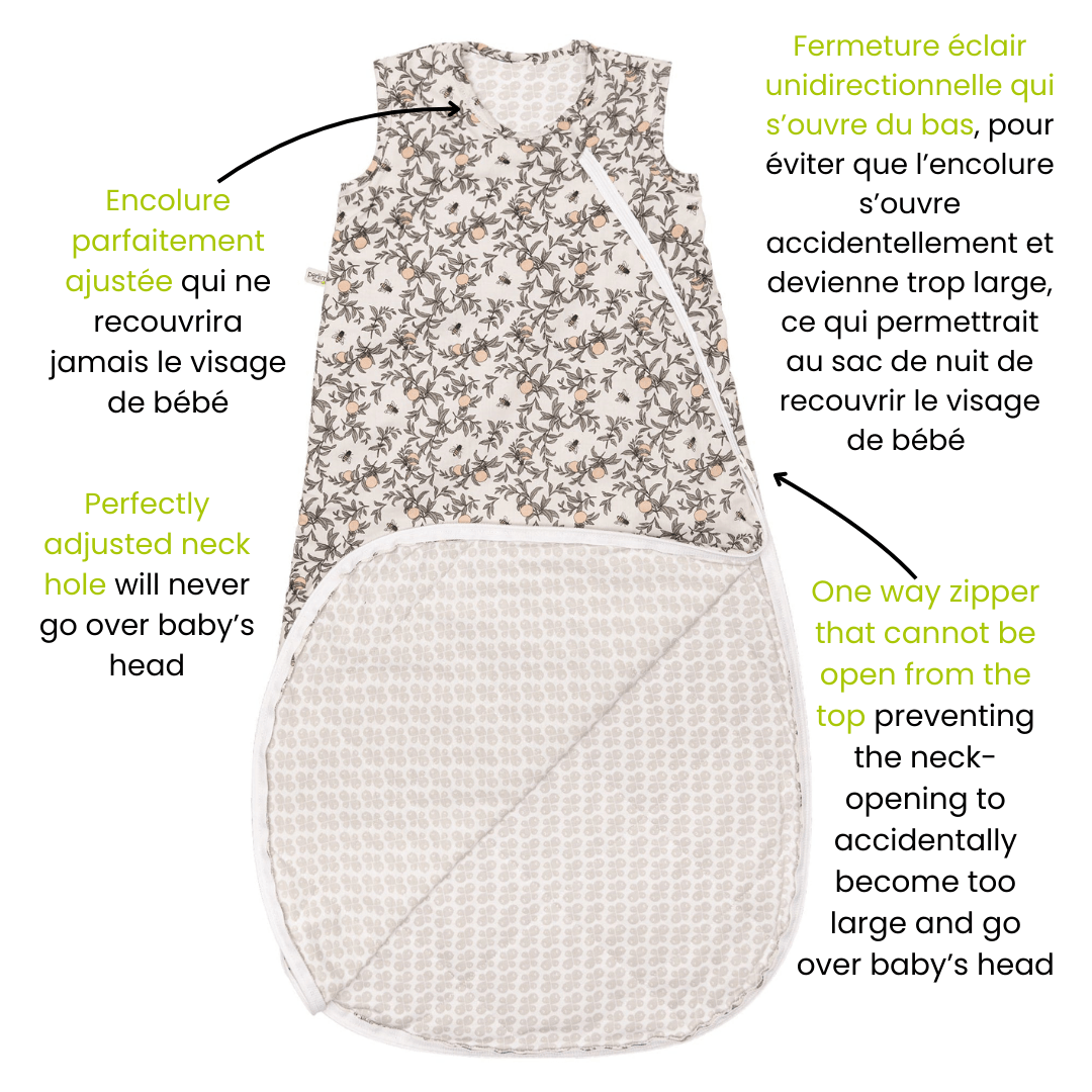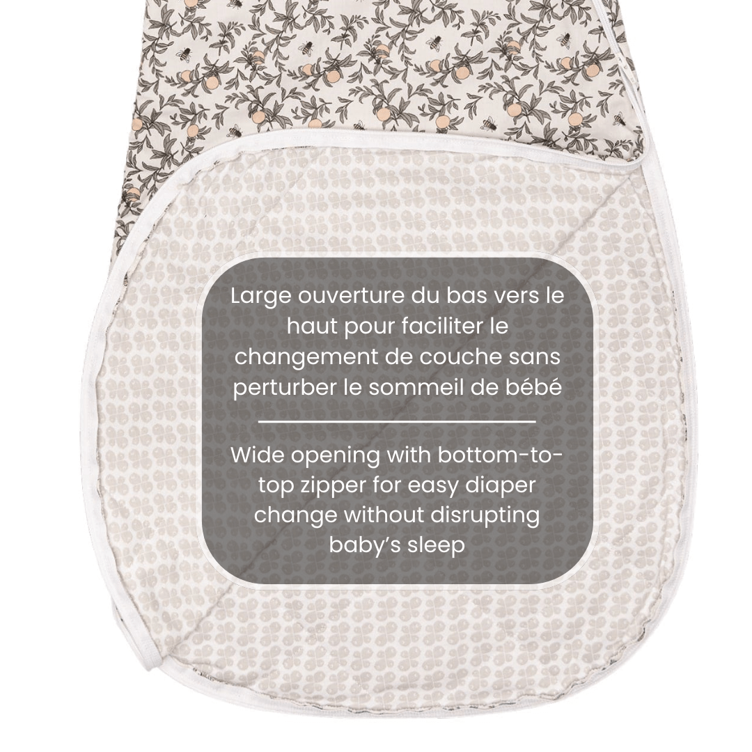 Embrace comfort and tranquility with our woven cotton sleep sack, beautifully crafted with a charming honeybee pattern. Designed for your baby's peaceful nights, this 2.0 TOG sleep sack offers the perfect blend of warmth and breathability. The gentle natural tones and delicate bee motifs create a soothing environment, enhancing your bedtime routine. Created by parents who understand your needs, it features an inverted zipper for convenient diaper changes, ensuring your baby stays snug and secure. Thoughtfully designed in Canada, this sleep sack meets the highest safety standards, offering a trusted sleep solution for your little one.