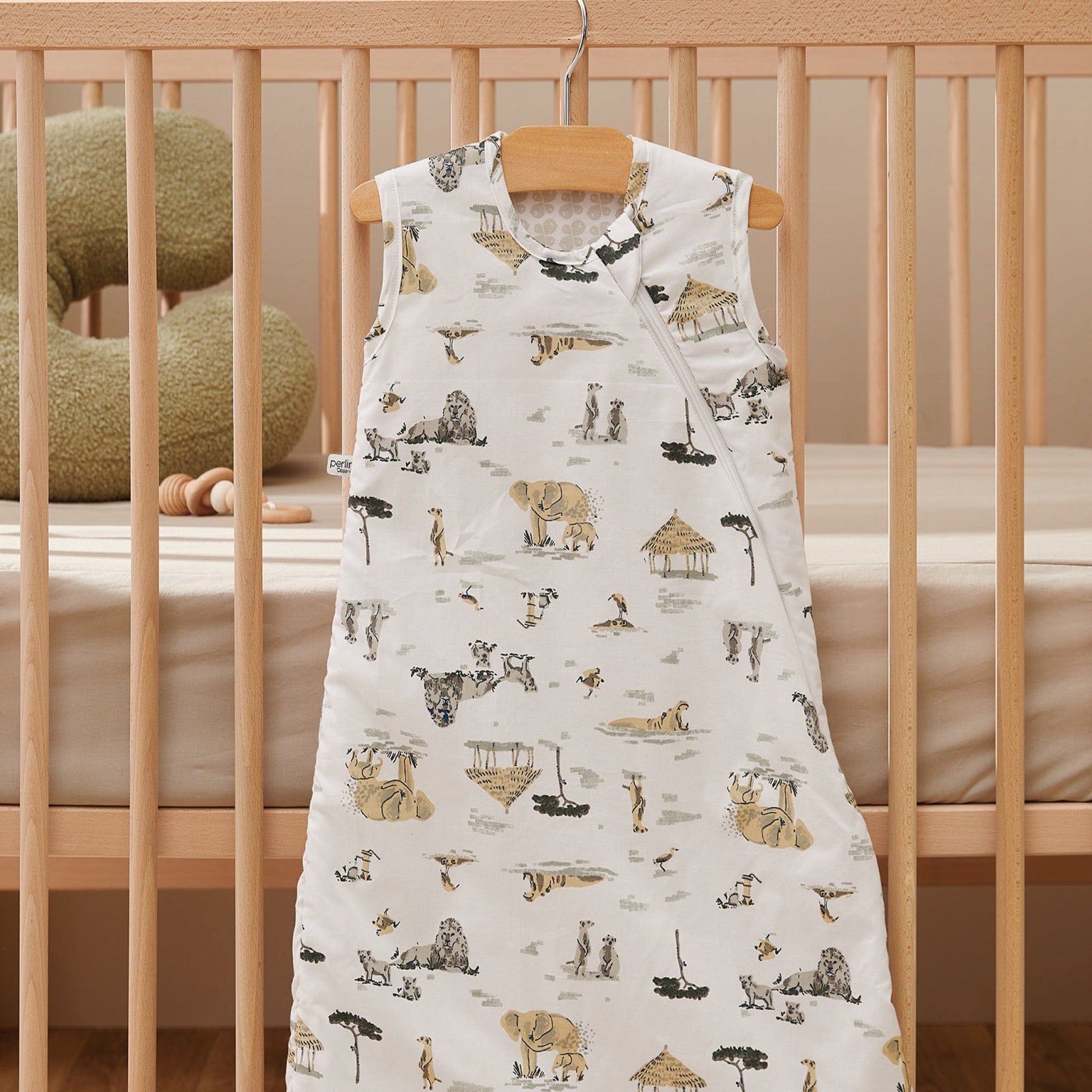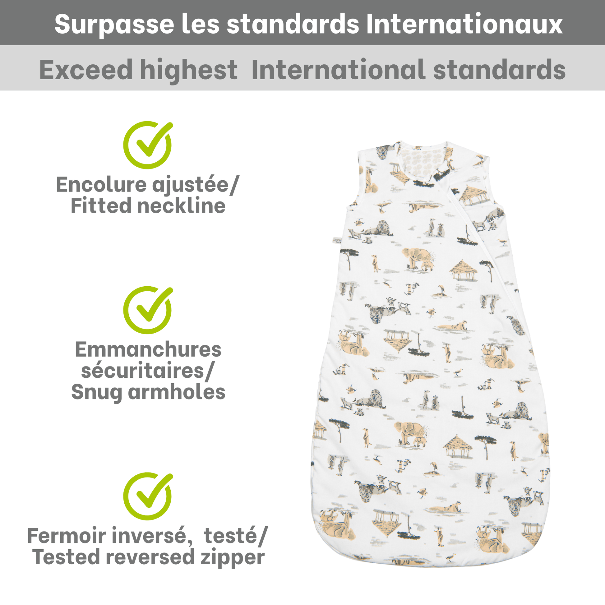 Introduce your baby to the wonders of the wild with our Safari-themed woven cotton sleep sack (2.0 TOG). Crafted for comfort and peace of mind, this sleep sack features playful safari animals in calming tones, enhancing your baby's sleeping environment. Made from natural cotton, it is gentle on sensitive skin, ensuring a cozy night’s sleep. The inverted zipper allows for easy diaper changes without disturbing your little one’s rest. Designed in Canada by parents who understand the needs of modern families, this sleep sack meets international safety standards and is a trusted choice for your baby's comfort and safety.