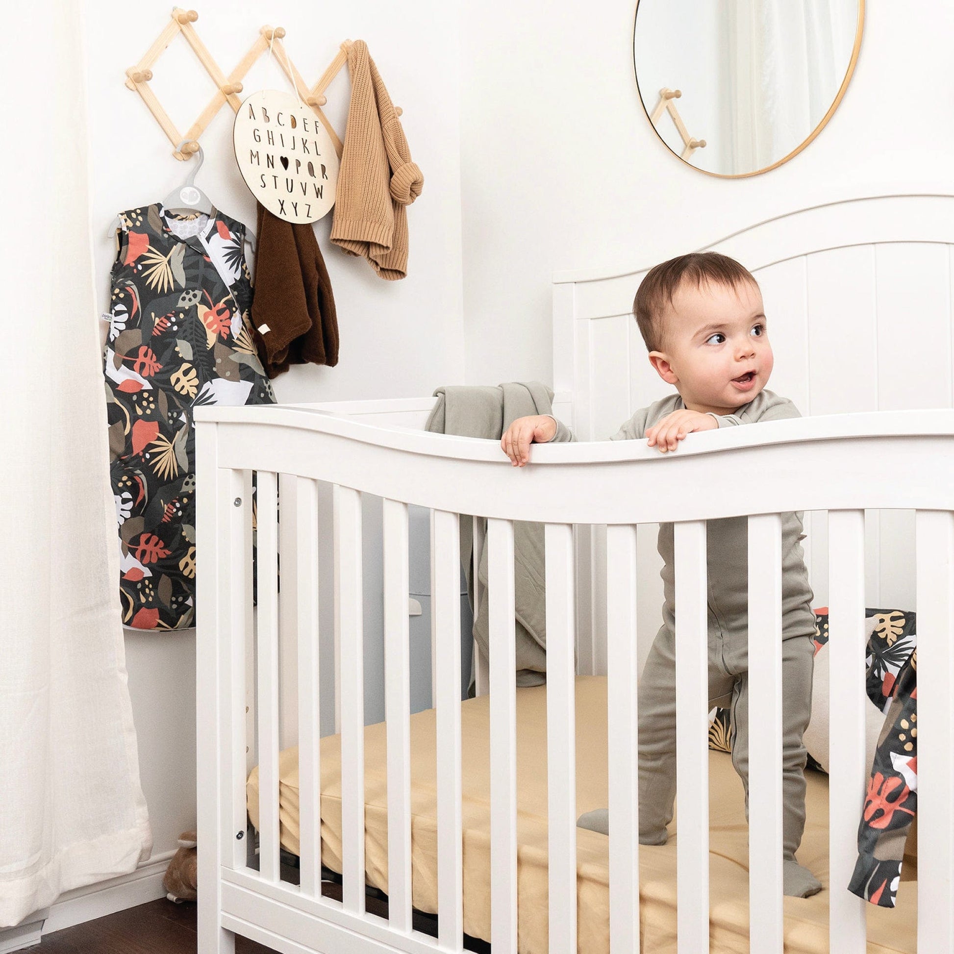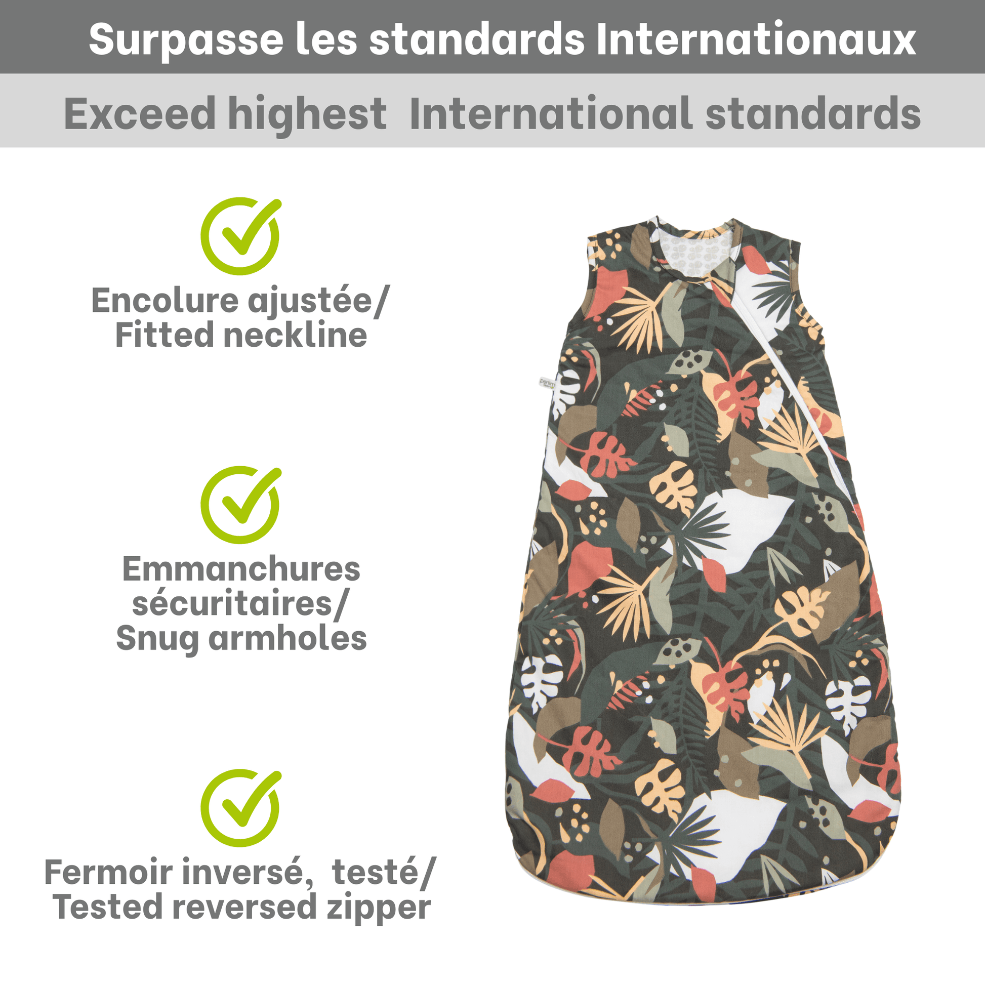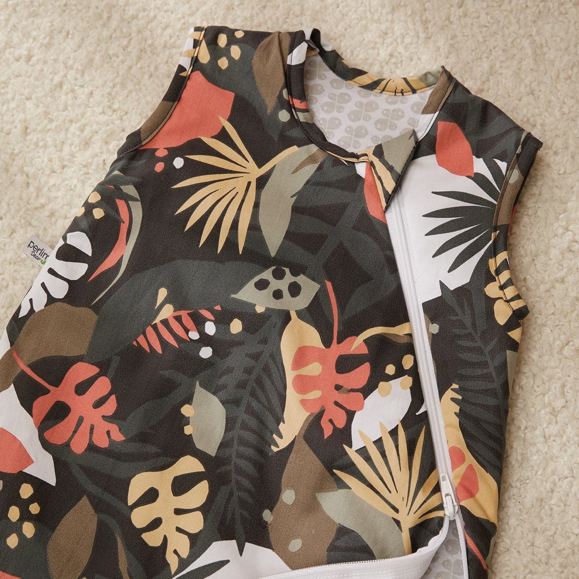 Wrap your baby in the comfort of our tropical-themed woven cotton sleep sack, designed to provide peace of mind for new parents. This 2.0 TOG sleep sack is crafted with soft, breathable cotton, featuring an enchanting array of lush leaves and calming earth tones. The practical inverted zipper allows for easy diaper changes without disturbing your little one's rest. Designed in Canada with safety in mind, this sleep sack is free from removable parts, ensuring a clutter-free crib. Trust in a product rigorously tested to meet international safety standards, bringing a soothing rhythm to your baby's bedtime routine.