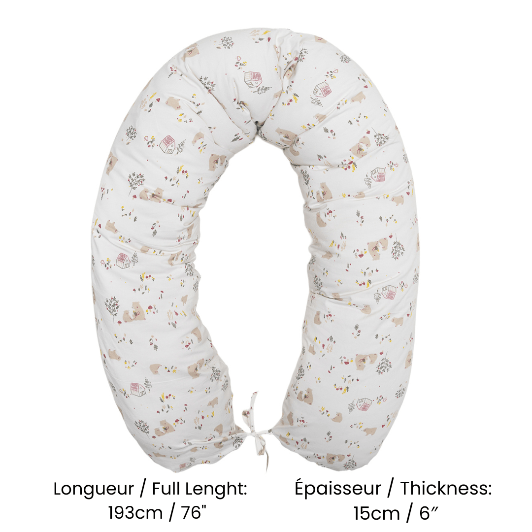 Pensé pour t’offrir un vrai moment de répit, cet oreiller de grossesse multi-fonctions enveloppe ton corps tout en douceur. Ce coussin de maternité polyvalent au Canada aide à mieux répartir la pression et à trouver une position plus confortable pour dormir, même quand la bedaine prend toute la place. Sa housse en coton, avec ses petits ours et ses détails de forêt dans des tons tout doux, apporte une touche réconfortante à ton lit ou à ton coin détente. Tu peux l’utiliser comme coussin de corps pour diminuer les tensions au dos et aux hanches, puis le garder près de toi après l’accouchement comme coussin d’allaitement ou de biberon. Conçu au Canada par des parents qui connaissent bien les nuits entrecoupées, il t’accompagne de la grossesse aux premiers mois avec bébé.