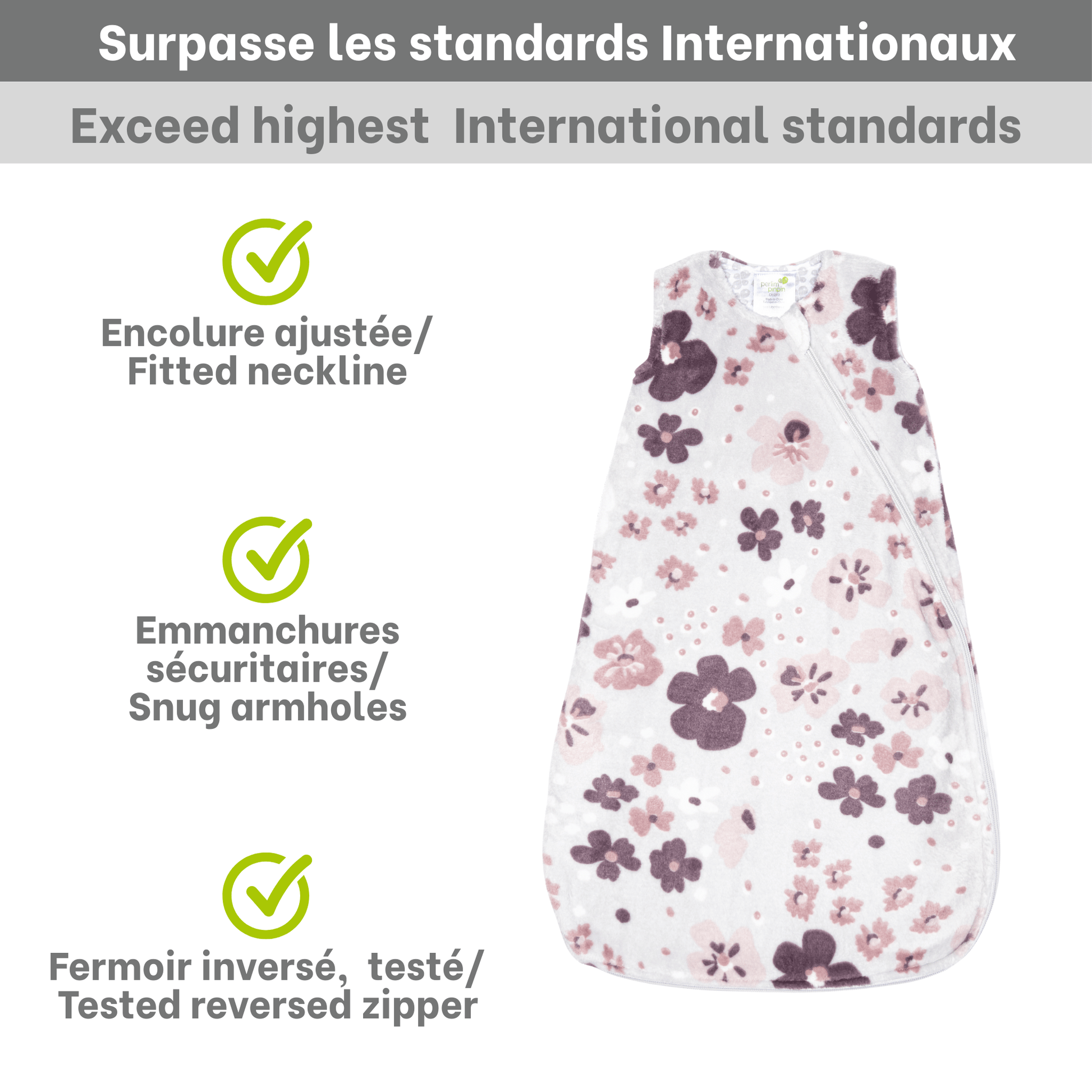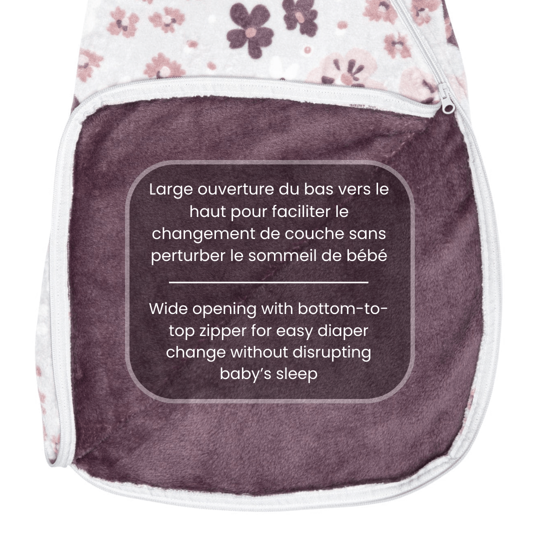 Enveloppe ton bébé de douceur avec notre sac de nuit en peluche, orné d'un motif floral délicat qui murmure chaleur et confort. Conçu au Canada avec soin, ce sac de nuit 1.5 TOG est fabriqué à partir de matériaux recyclés, parfait pour les nuits fraîches. Sa texture douce assure confort et liberté de mouvement, favorisant un sommeil paisible. Une fermeture éclair inversée facilite les changements de couches nocturnes, garantissant un sommeil ininterrompu. Fais confiance à un produit qui met la sécurité en priorité, testé rigoureusement pour répondre aux normes internationales.