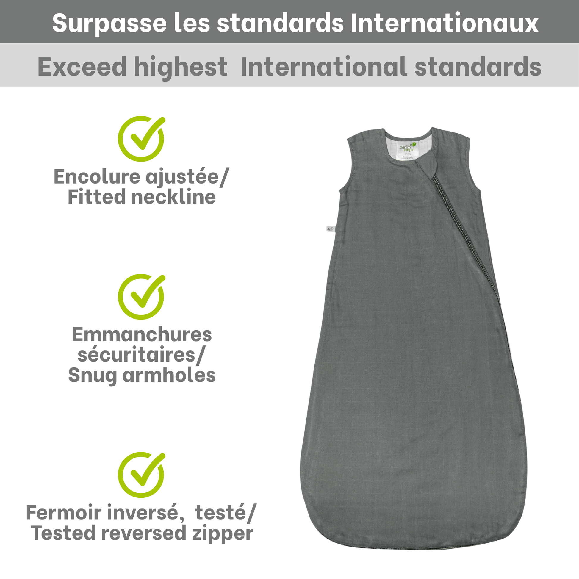 Wrap your baby in comfort with our 0.7 TOG cotton muslin sleep sack. Designed for spring and summer, this breathable and lightweight sleep sack ensures your baby stays cozy without overheating. Crafted from 100% cotton muslin, it becomes softer with each wash, offering gentle care for sensitive skin. The subtle charcoal hue adds a calming touch to any nursery. Thoughtfully created by parents for parents, this sleep sack is rigorously tested to meet international safety standards, offering peace of mind throughout the night.