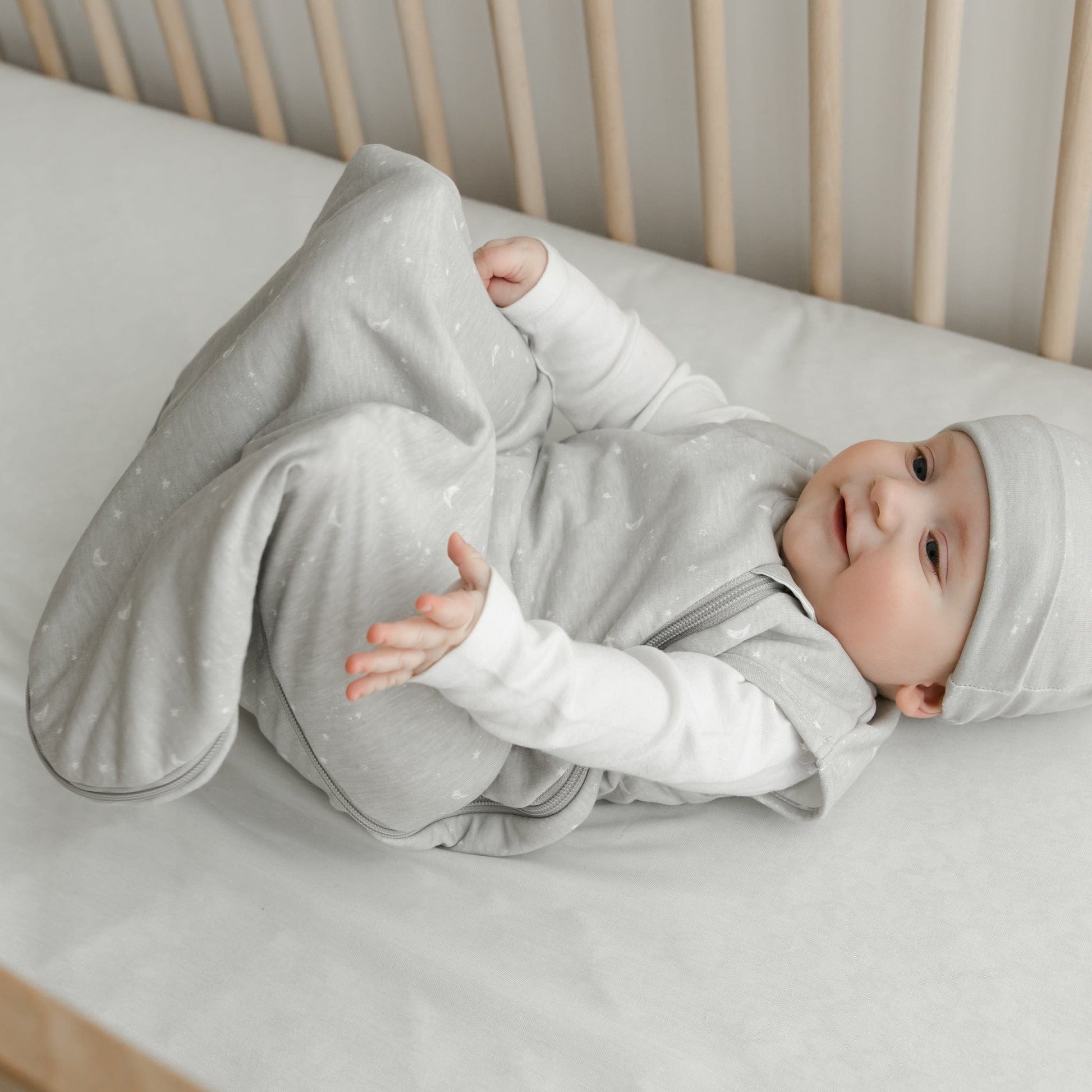 Embrace peaceful nights with our quilted bamboo sleep bag, designed to provide warmth and security. This 2.5 TOG sleep sack features a subtle moon and star pattern, bringing a gentle touch to your baby's sleep environment. Crafted from a soft bamboo-cotton blend, it offers breathable comfort, perfect for cooler nights. The Canadian design ensures a secure fit with a well-adjusted neckline and a reverse zipper for easy diaper changes. Trust in our commitment to safety, with rigorous third-party testing for quality assurance.