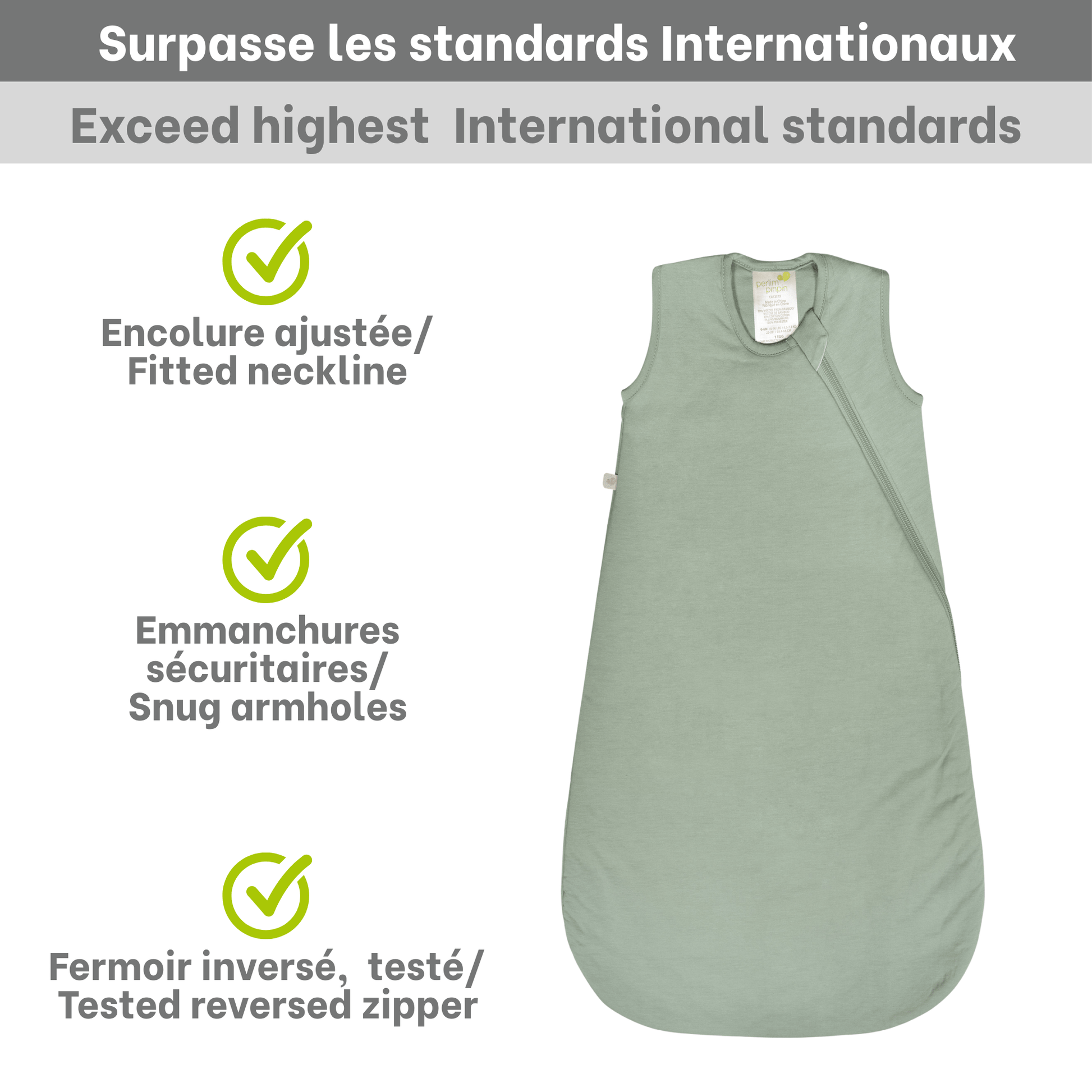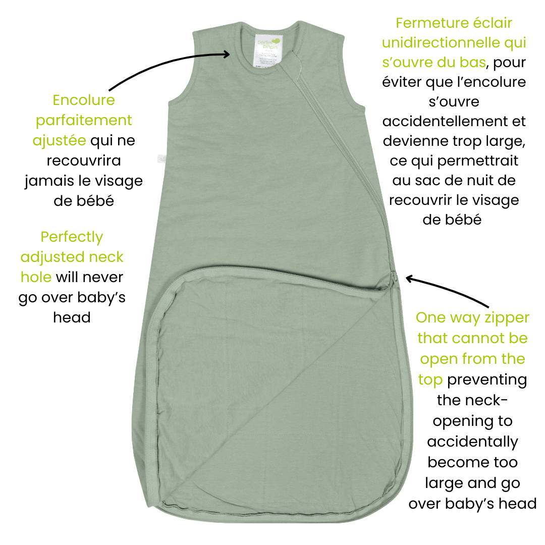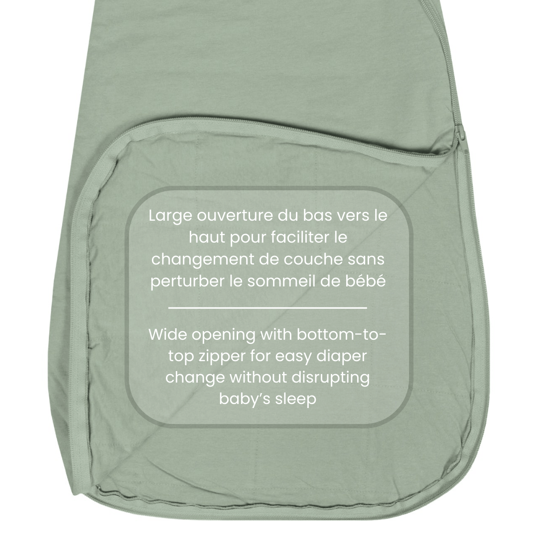 Embrace the cozy nights with our quilted bamboo sleep sack (2.5 TOG), designed to keep your baby snug during the cooler months. The gentle moss green hue adds a serene touch to bedtime, while the bamboo-cotton blend ensures softness and breathability, ideal for babies with sensitive skin. Thoughtfully crafted by parents who understand family life, this sleep sack features a safe neckline and a convenient bottom-up zipper for easy changes. Designed in Canada and rigorously tested to meet international safety standards, it’s a comforting choice for your baby's nightly routine.