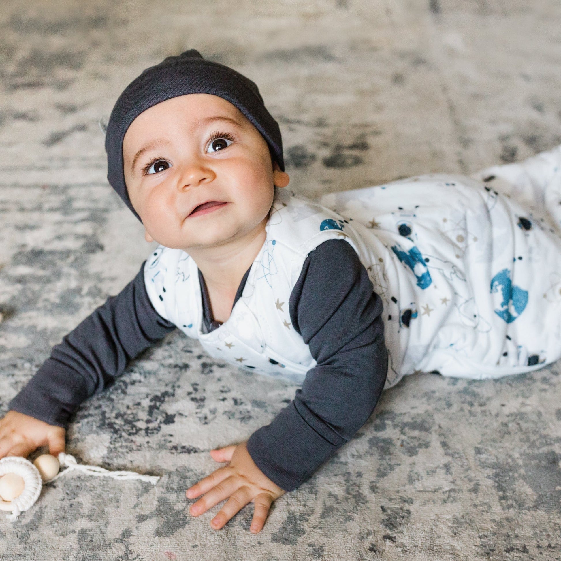 Introduce your baby to the wonders of the universe with our quilted bamboo sleep sack (1.0 TOG), designed for comfort and safety. Featuring a delightful space-themed print with whimsical astronauts and stars, this sleep sack transforms bedtime into a dreamy adventure. Made from a breathable bamboo-cotton blend, it's perfect for sensitive skin and encourages a healthy sleep routine. Designed in Canada, this sleep sack includes a convenient reverse zipper for seamless nighttime changes. Tested by third-party labs, it ensures your baby's safety and your peace of mind, meeting international standards for a secure sleep environment.